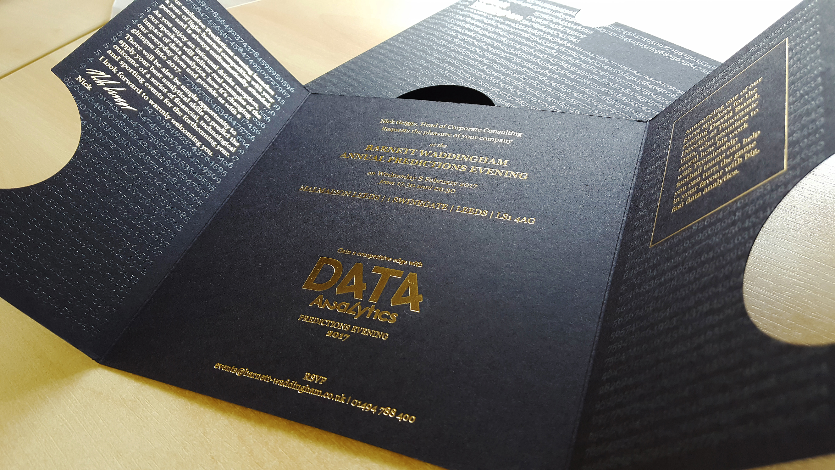 Special effects can greatly enhance the look and feel of a printed piece and these invitations for Barnett Waddingham are a good example.