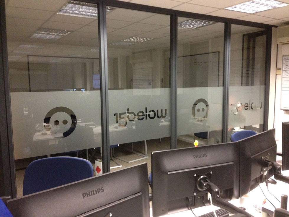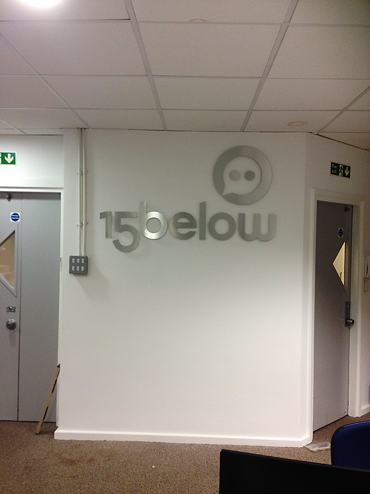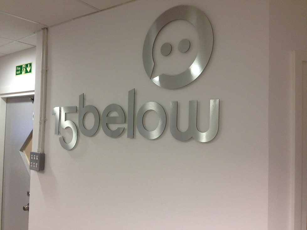 High quality internal signage produced for 15Below in Brighton. The wall sign is a fret cut brushed aluminium finish on locators and the graphics for the meeting room are frosted vinyl.