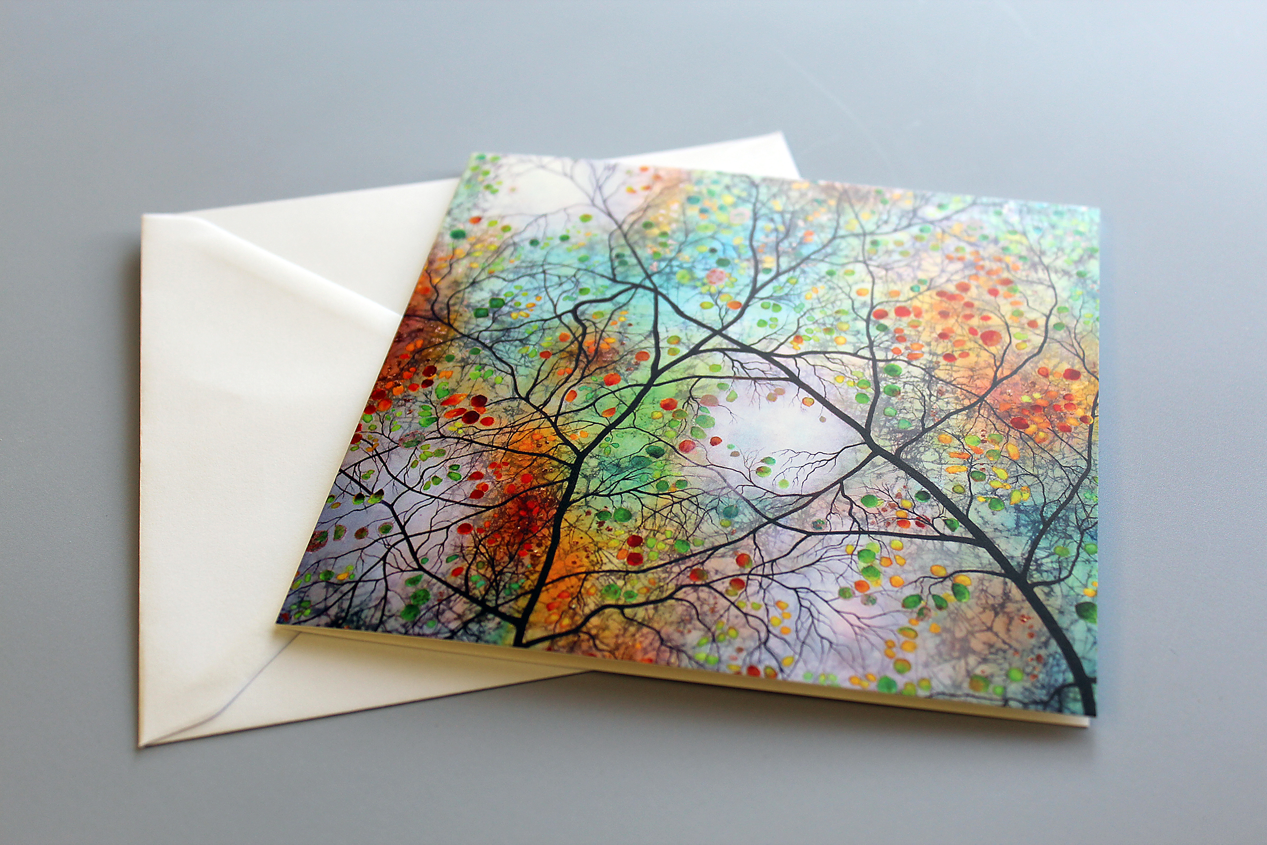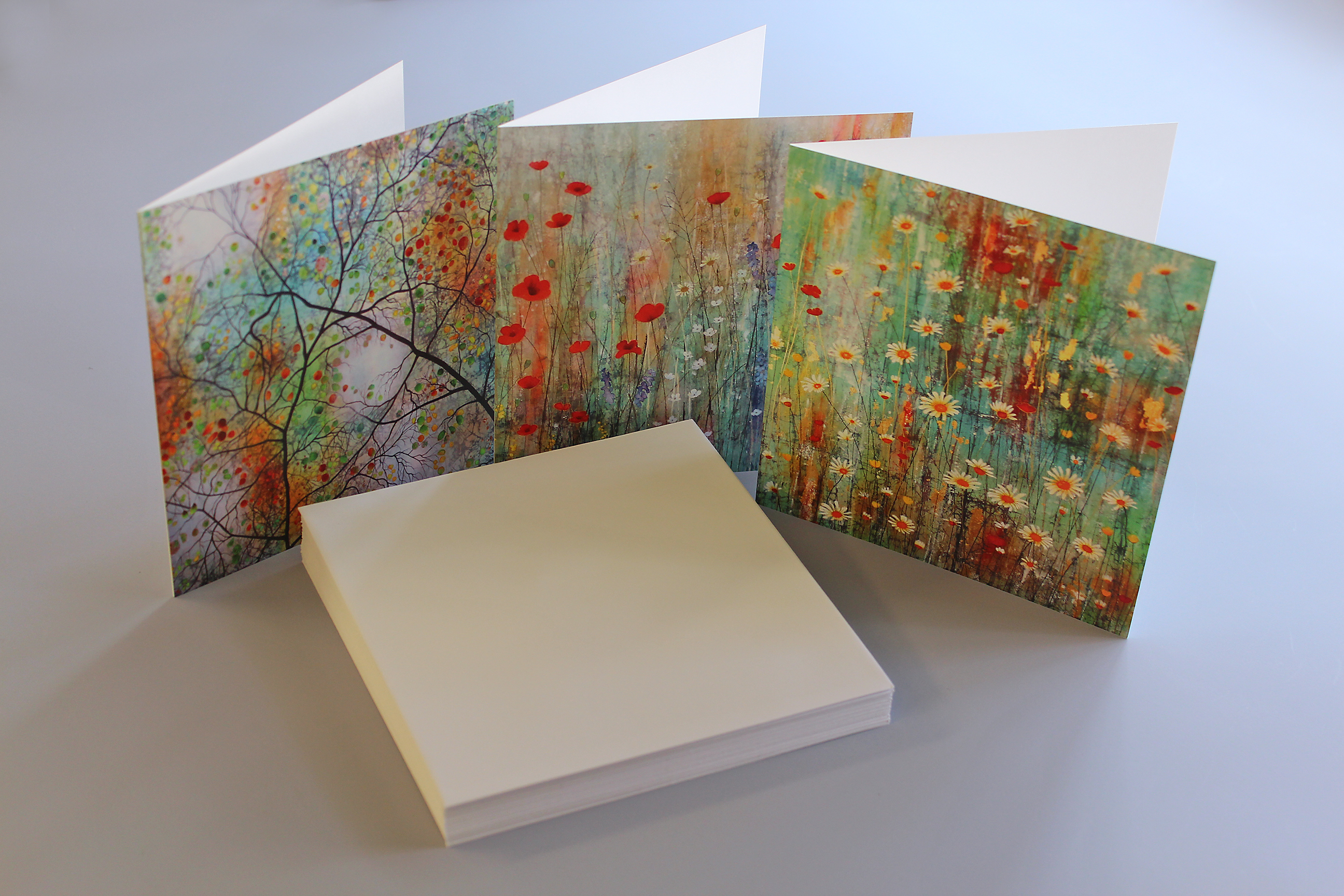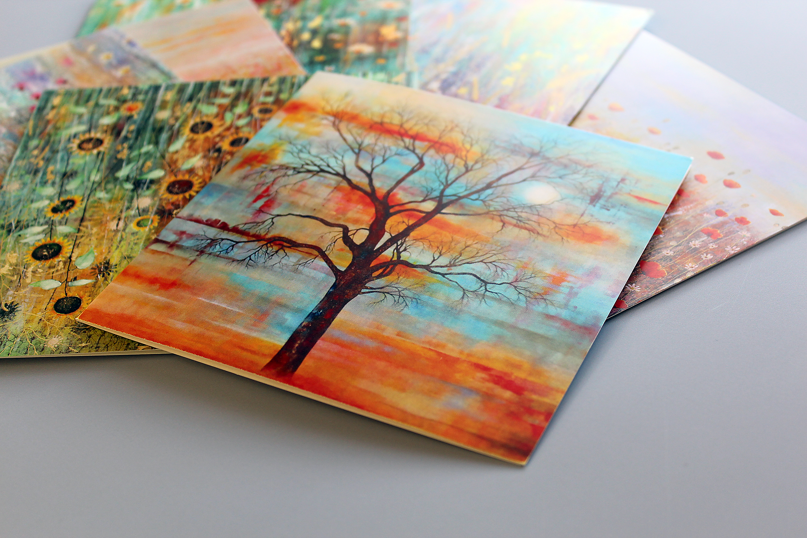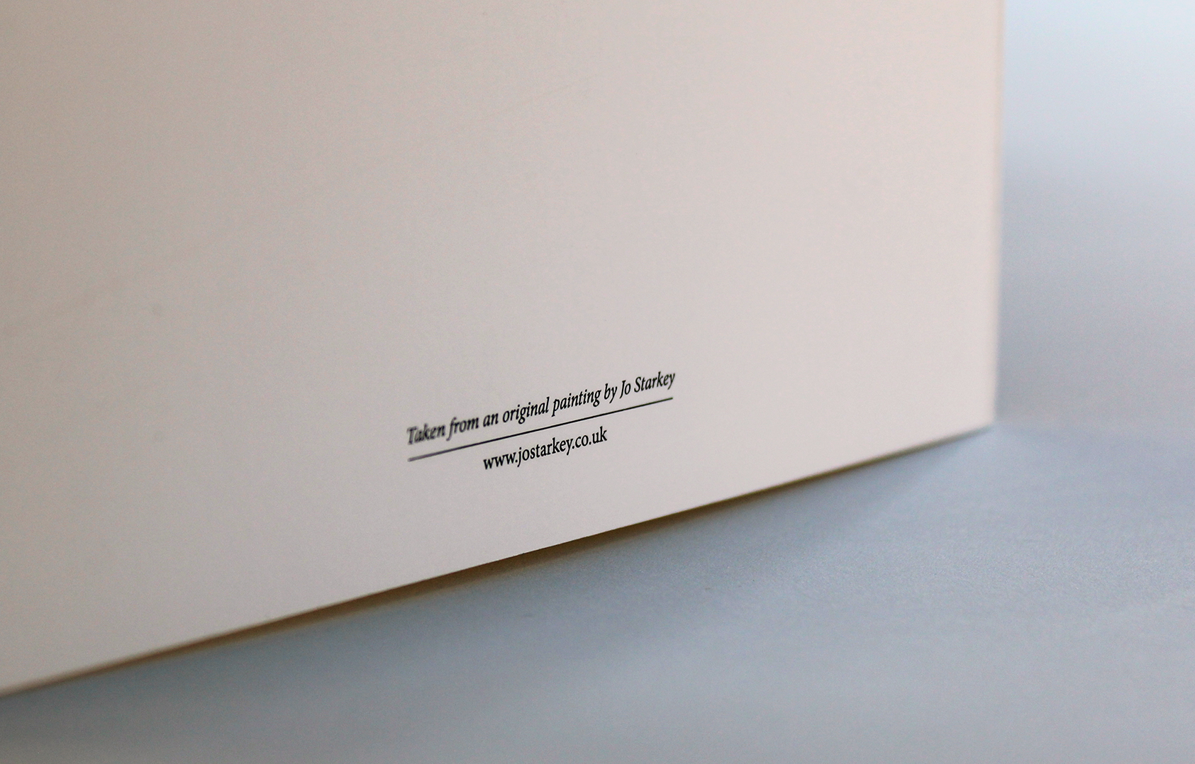 Artist Jo Starkey commissioned Elephant to produce a small run of her beautiful images as greeting cards. There are 12 different designs printed onto Invercote single sided greeting card board and these were supplied with diamond flap envelopes and cellophane wraps. The finished size is 144 x 144mm.