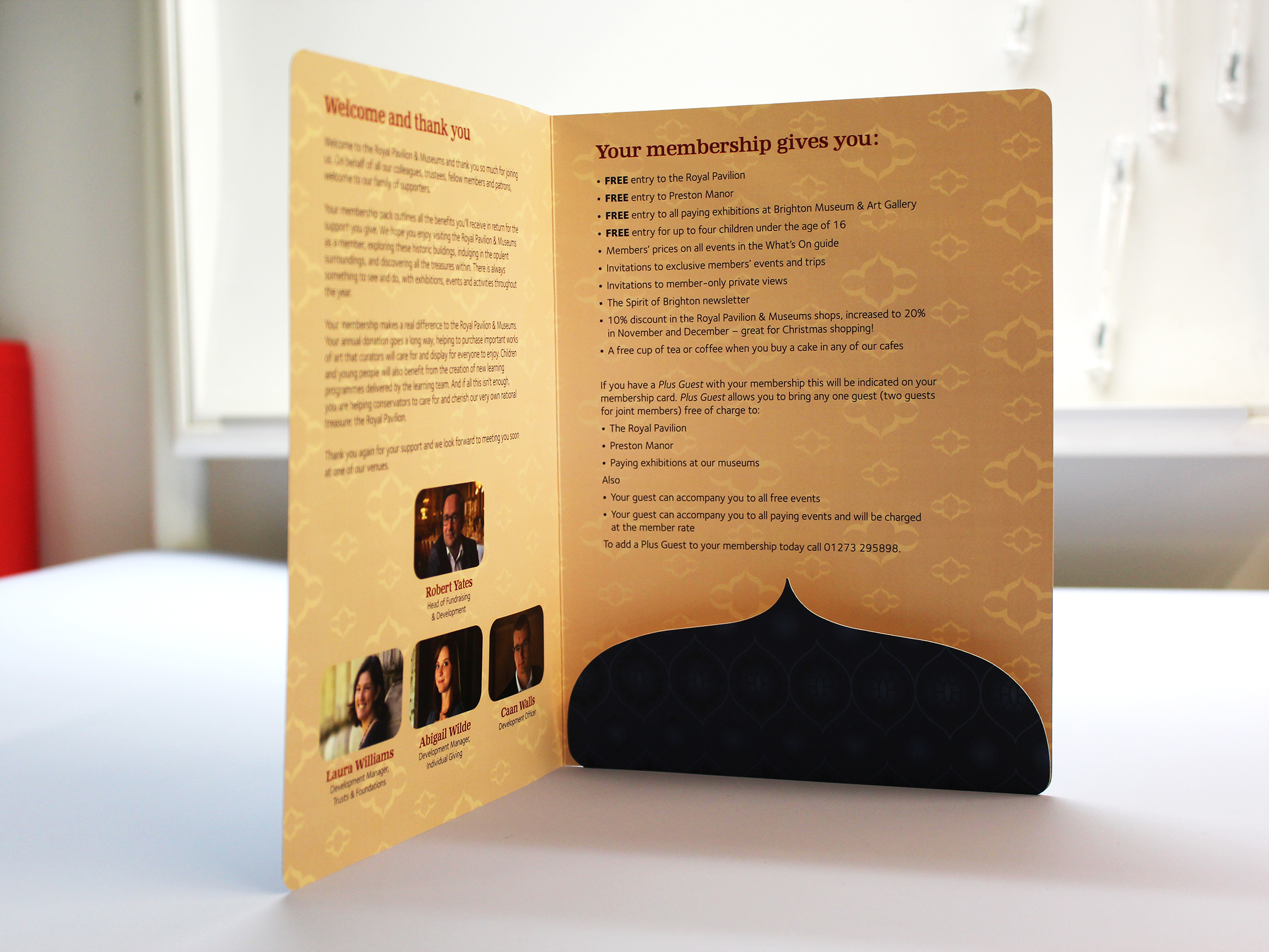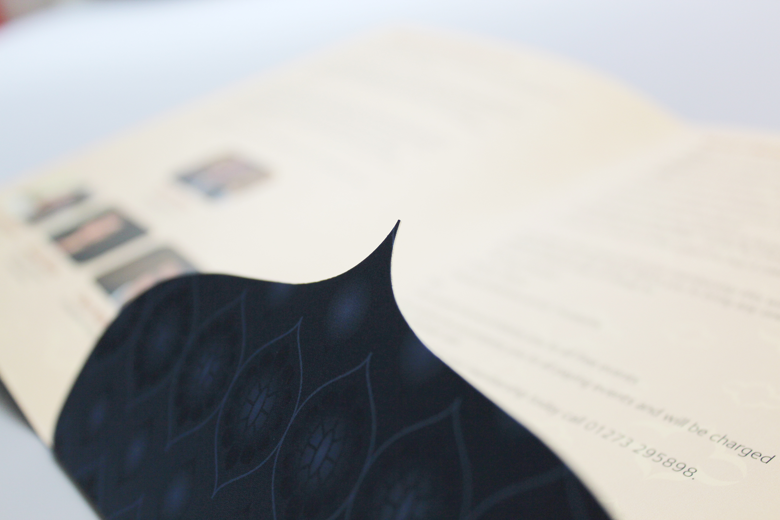 A good example of how die-cutting can add a creative element to a project. These 4 page A5 leaflets were printed onto 350gsm silk board and matt laminated both sides, the designer wanted a flap on page 3 that reflected the dome of the Royal Pavilion and a tool was made to the correct shape. This particular shape was technically challenging owing to the sharp point but the end result is perfect.