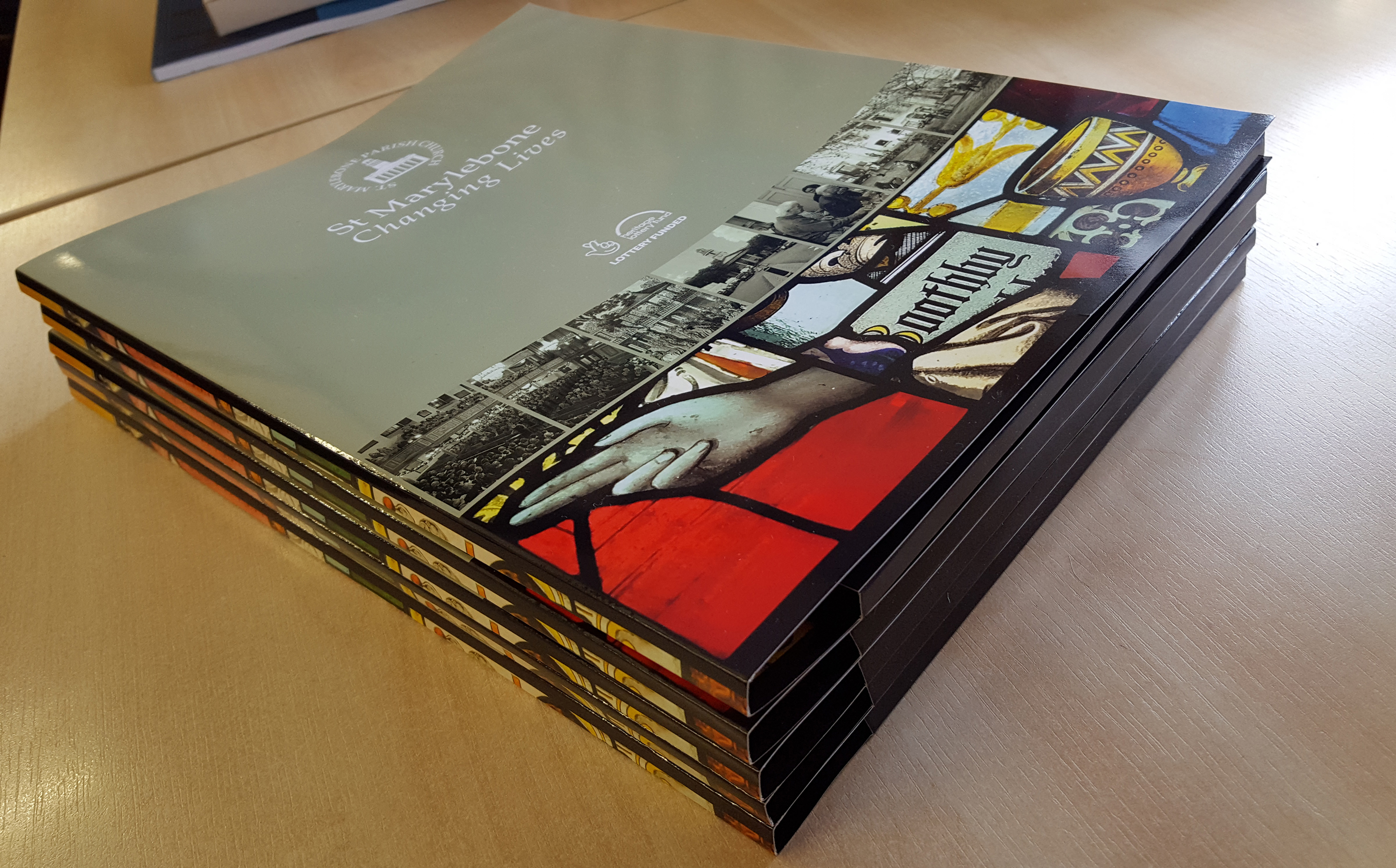 Capacity folders produced for St. Marylebone. 350gsm gloss board with gloss overlaminate and die-cut to include a pocket.